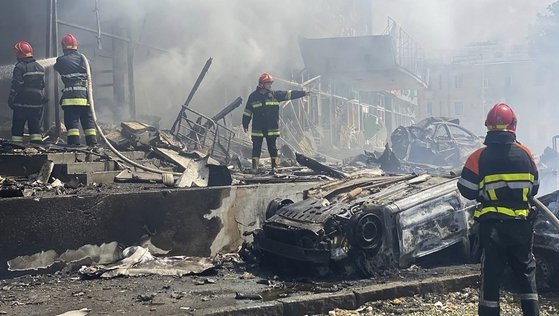 14일(현지시간) 러시아군의 미사일 공격으로 파괴된 우크라이나 빈니차 건물. [AP=연합뉴스]