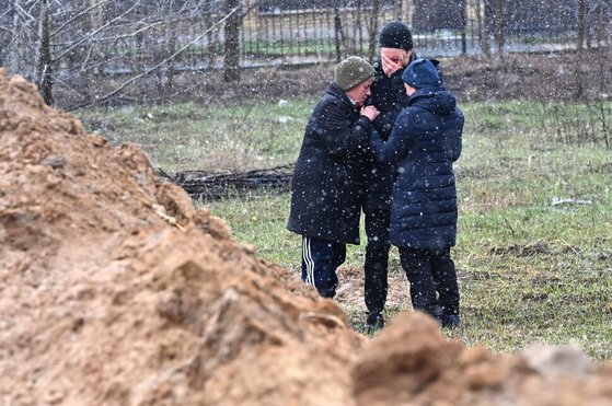 지난 4월 3일(현지시각) 우크라이나 수도 인근 도시 부차에서 발견된 집단 매장지에 사람들이 모여 애도하고 있다. [AP=연합뉴스]