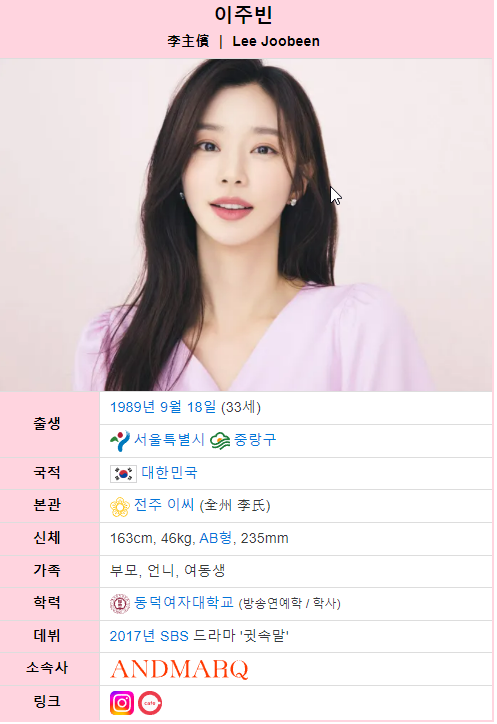 1989년생 올해 나이 34세 이주빈은 배우로서 입지를 다지고 있는 이주빈은 사실 데뷔 전 DSP 엔터테인먼트의 연습생으로 있으면서 걸그룹 '레인보우'의 1기 멤버로 발탁되어 보컬을 맡았으나 데뷔가 지연되면서 탈퇴했습니다.